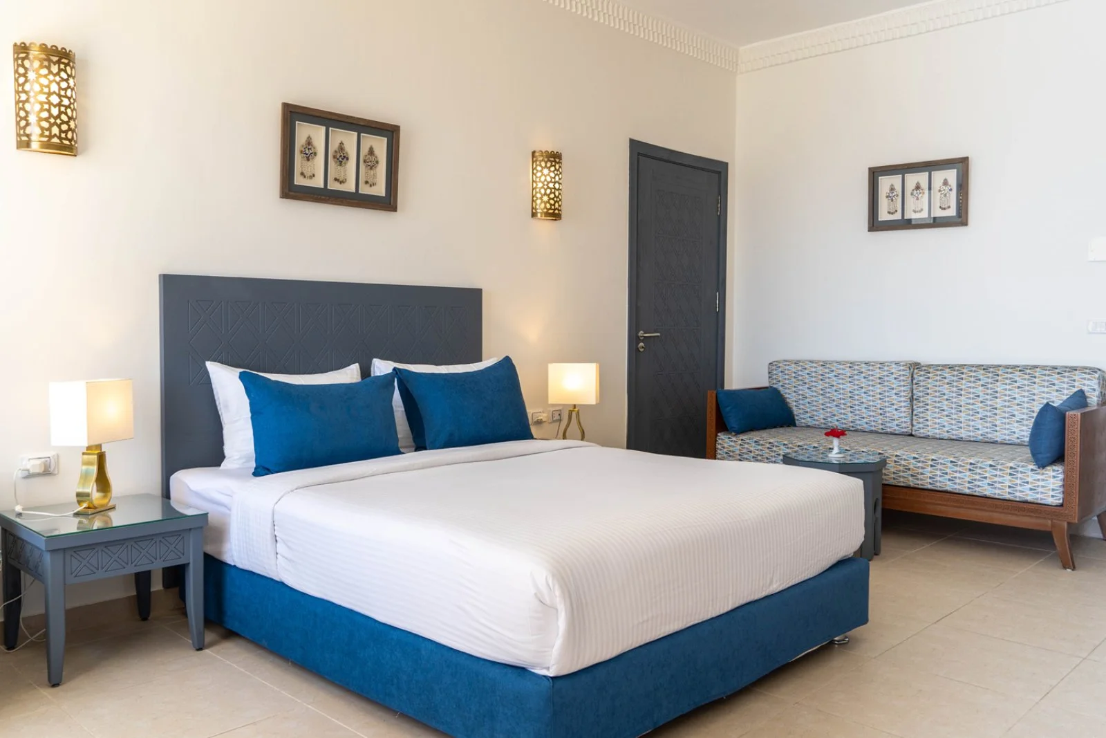 126 camere, dotate di servizi privati, aria condizionata, TV satellitare, telefono, cassetta di sicurezza, minibar (1 bottiglia d’acqua per persona al giorno inclusa), asciugacapelli, balcone o terrazza. Disponibilità di doppie vista giardino, piscina o mare (max 3 adulti o 2 adulti + 1 bambino), suite con area soggiorno e family room con due ambienti separati e un bagno (max 4 adulti o 3 adulti + 1 bambino). È inoltre disponibile un numero limitato di camere con letti a castello (max 3 adulti + 1 bambino o 2 adulti + 2 bambini).