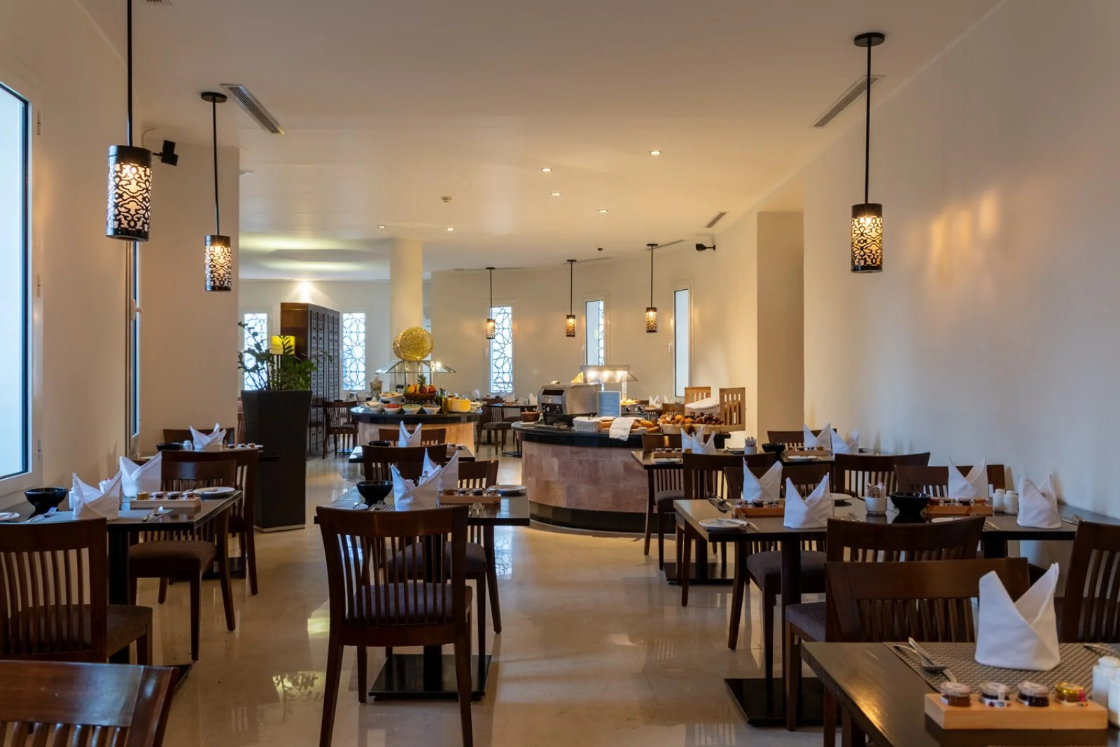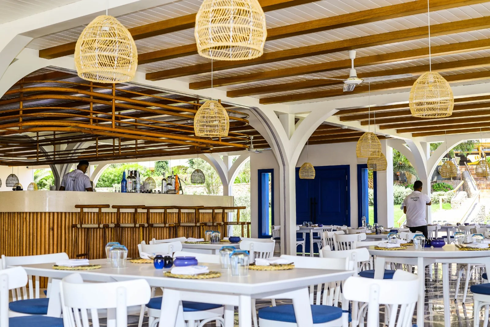 Ristoranti principali a buffet nelle due aree. Ristorante à la carte riservato alle ville per colazione e cena, con servizio al tavolo. Ristorante in spiaggia, ristorante greco disponibile a pranzo per i clienti della West Bay e delle Villas e a cena a giorni fissi su prenotazione per tutti gli ospiti dell'hotel, pizzeria aperta a pranzo e diversi bar. A pagamento: ristorante Pavilion, Club 159 (solo adulti, incluso nella formula premium e per i clienti in villa). Cenoni di Natale e Capodanno inclusi.