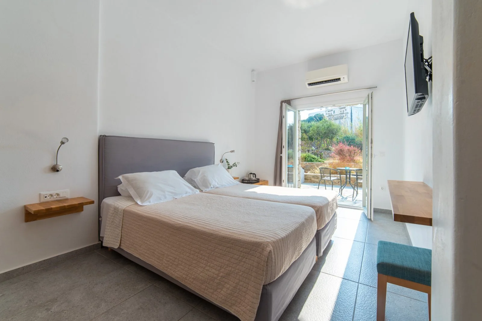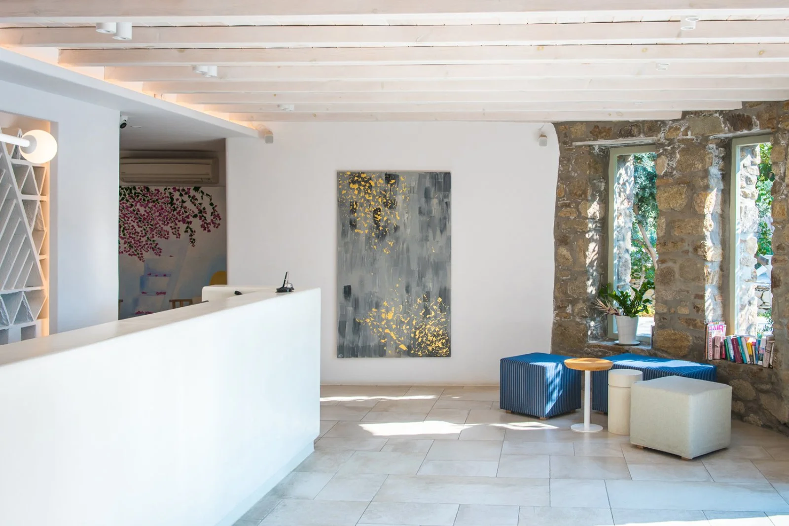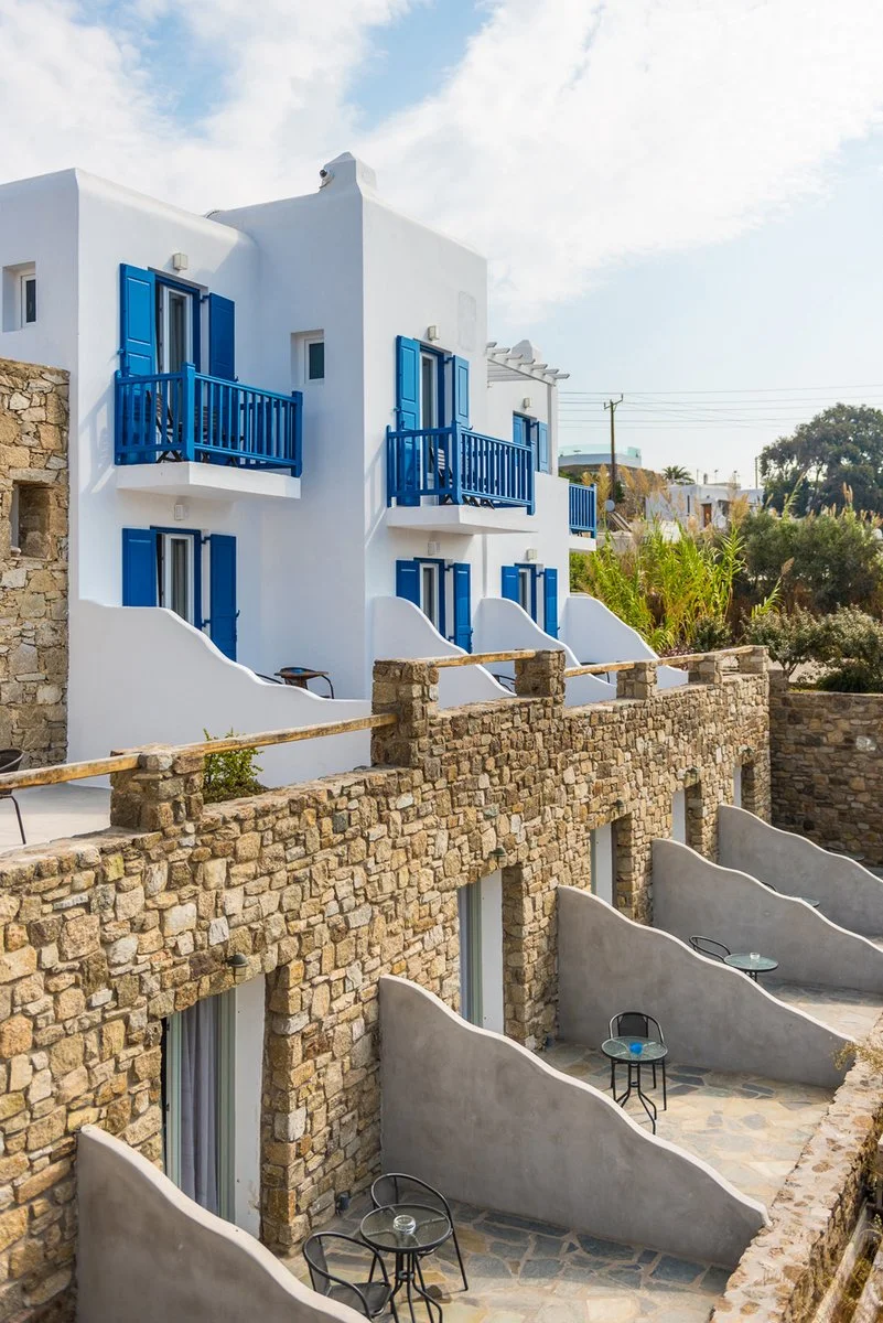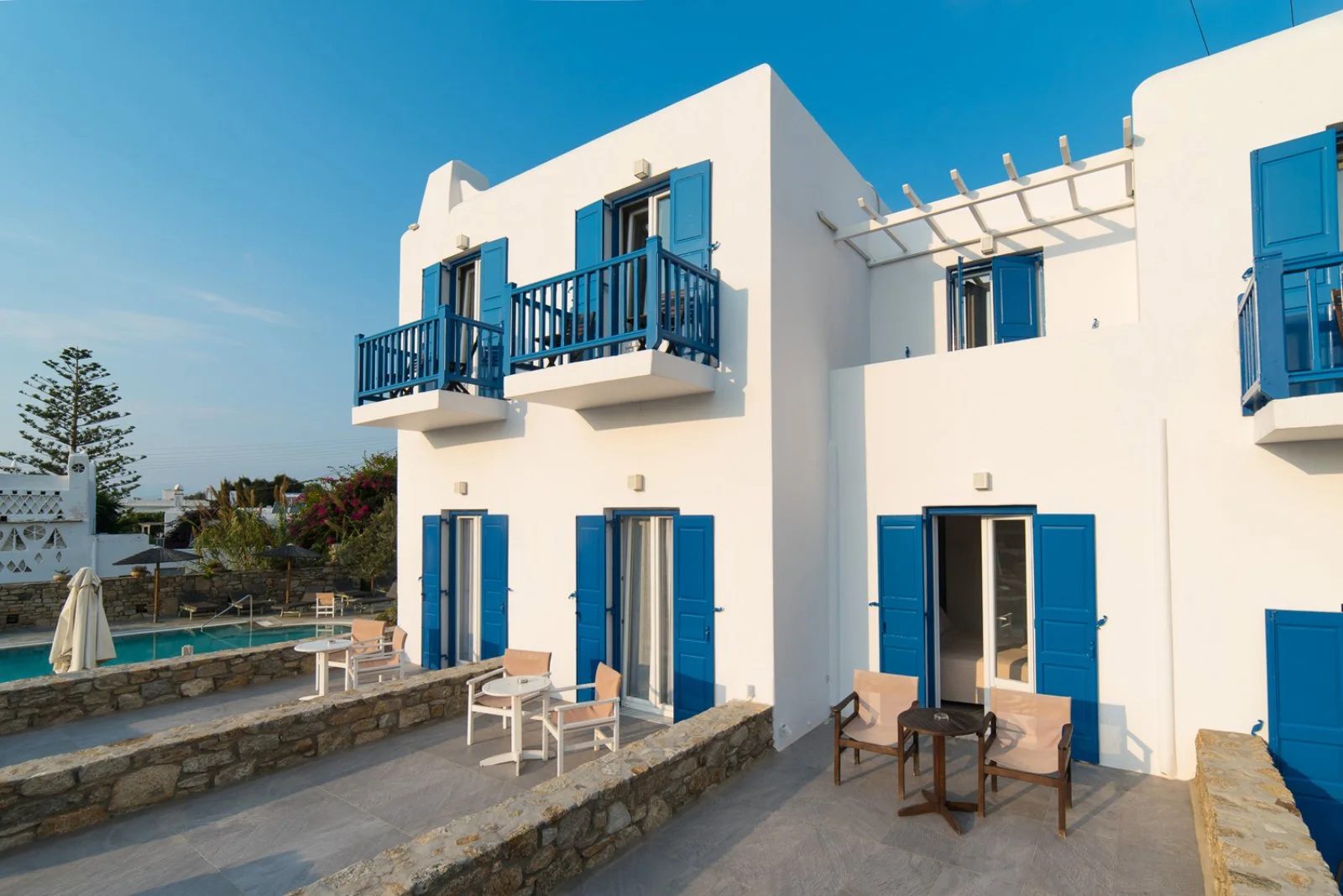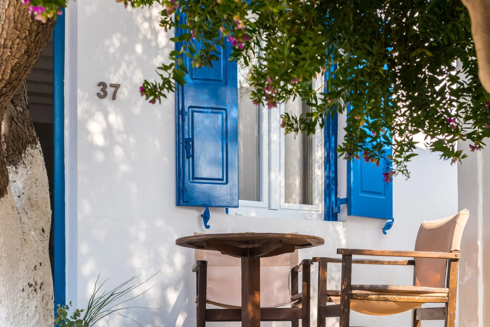 Grazioso e curato hotel, decorato nel tipico stile cicladico, con pareti bianche e finestre blu.