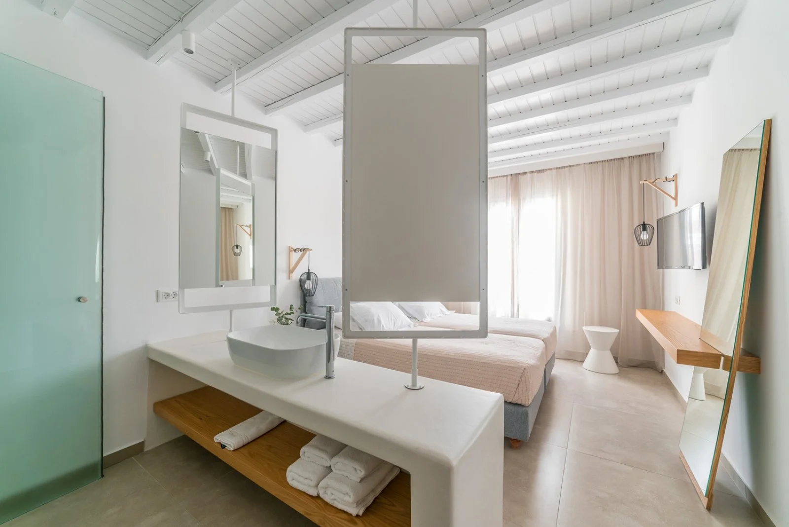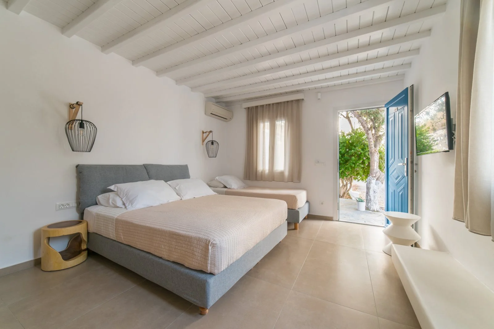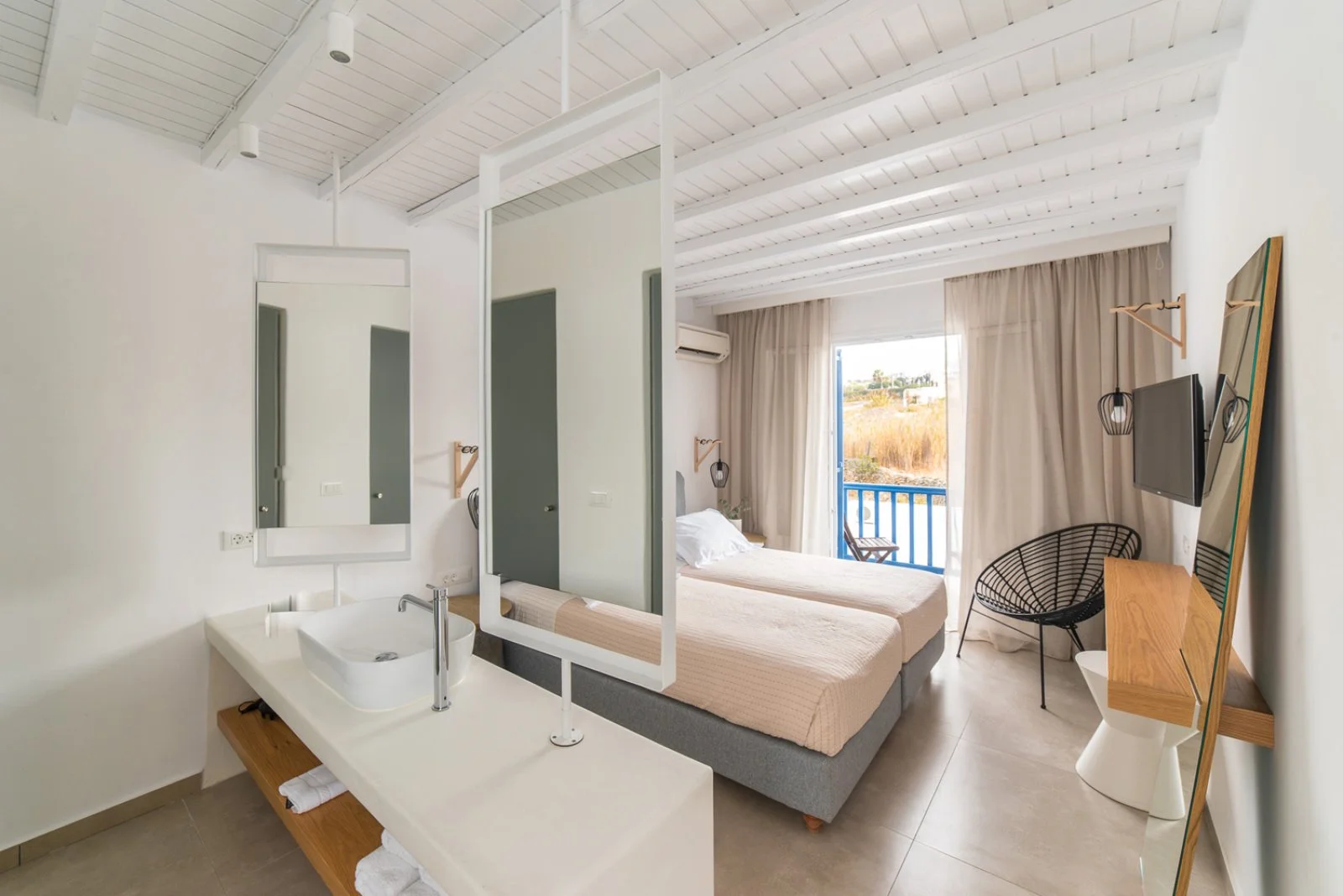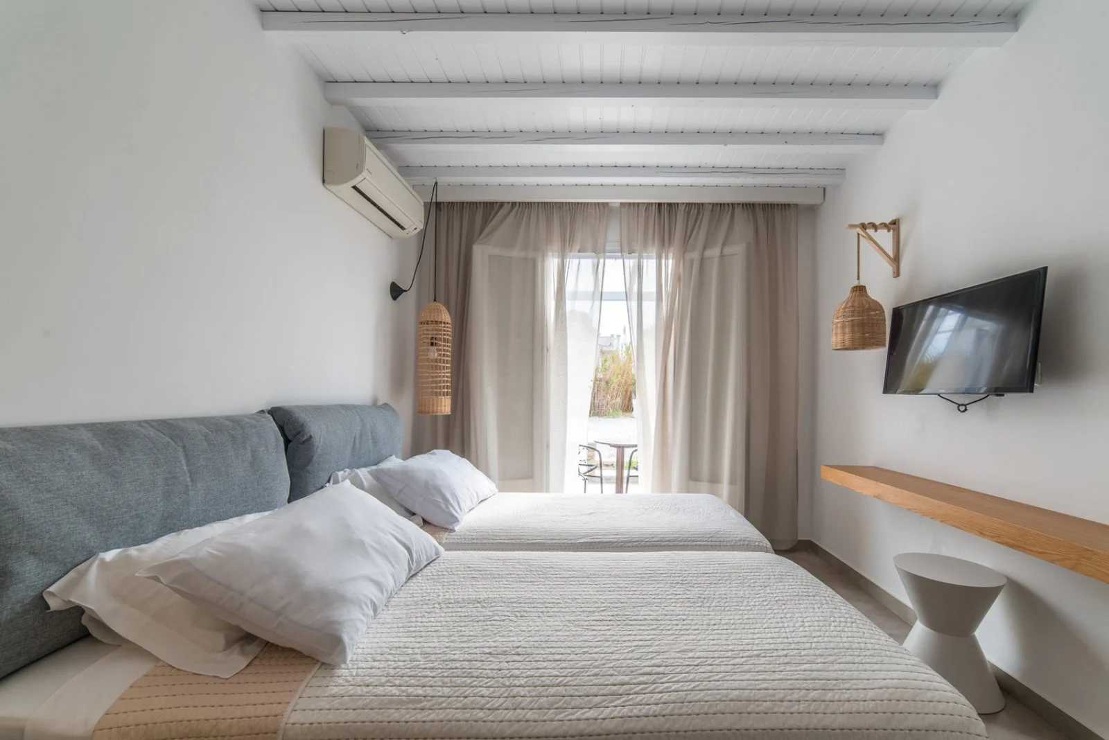 Grazioso e curato hotel, decorato nel tipico stile cicladico, con pareti bianche e finestre blu.