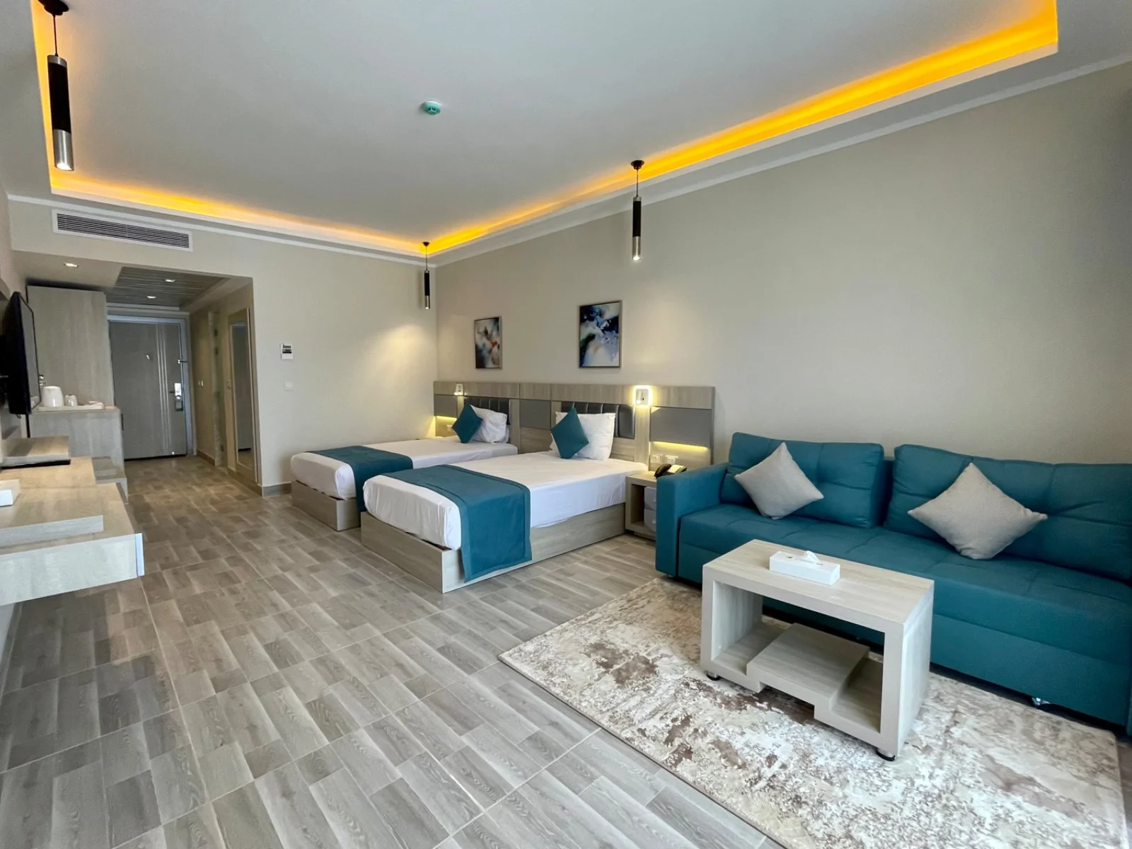 328 camere, suddivise in premium vista mare laterale, premium vista baia, premium lobby fronte mare, premium fronte mare (solo adulti a partire da 14 anni) e junior suite fronte mare (solo adulti a partire da 14 anni). Moderne e molto luminose, sono tutte dotate di servizi privati con asciugacapelli e specchio di cortesia, letto king size e sofa bed in grado di ospitare 2 persone, TV satellitare, aria condizionata con controllo individuale, cassetta di sicurezza, set per la preparazione di tè e caffè all’americana, balcone attrezzato con un tavolino e due sedie, minibar (primo rifornimento di acqua e soft-drink gratuito, una bottiglia grande di acqua minerale naturale al giorno), accappatoio e ciabatte da camera. Le junior suite dispongono inoltre di ampia cabina armadio e di zona notte rialzata con pavimento in legno.