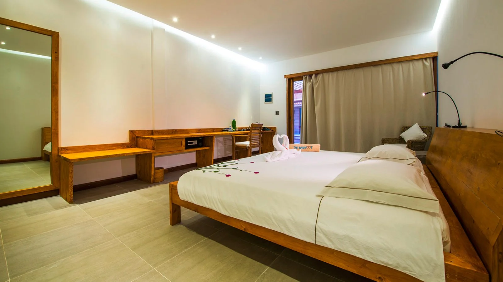 64 camere, tutte con servizi privati, aria condizionata, ventilatore a pale, telefono, cassetta di sicurezza, connessione wi-fi gratuita, bollitore, minifrigo, asciugacapelli. A pagamento, minibar. Una bottiglia di acqua in camera inclusa. Sono disponibili camere Seaside (44 m², max 2 adulti + 1 bambino), disposte una di fronte all’altra al piano terra ed a pochi metri dalla spiaggia con cortile interno di sabbia, con supplemento camere Beach Side (max 3 adulti), sulla zona nord della struttura con vista laterale sul mare e, disposte in blocchi di due piani, camere Beach Front (50 m², max 4 adulti) al piano terra con accesso diretto alla spiaggia e camere Ocean View, al primo piano con vista sull’oceano.